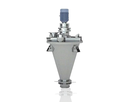 混合机搅拌部件一般为两条不对称螺旋,通过螺旋的快速自转将物料向上提升,形成沿筒壁自下向上的非对称螺柱形物料流;同时,螺旋借助悬臂的转动沿桶壁进行公转运动,使螺旋外的物料,不同程度进入螺柱包络线内,一部分物料被错位提升,另一部分物料被抛出螺柱,从而使全圆周方位的物料不断更新扩散;被提到上部的物料再向中间凹穴汇合,形成一股向下的物料流,从而形成对流循环。物料通过不断的剪切、对流、扩散等复合运动,在短时间内快速混合均匀。