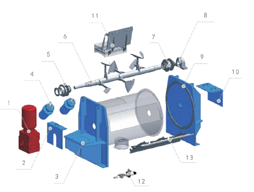 组成部件:混合机结构主要由传动部分、卧式筒体、犁刀组轴、飞刀组、出料阀、喷液装置等组成。